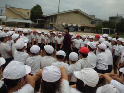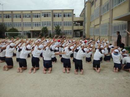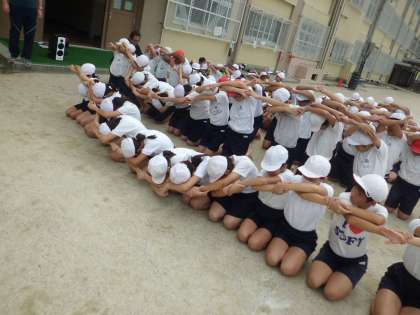 組体操のウェーブを運動場で行いました。砂が膝に当たる中にもかかわらず,我慢して頑張る姿が見られました。