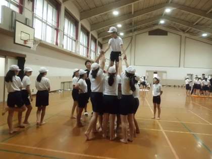 組体操では大技「人間起こし」に挑戦しました。みんなで声をかけ合うことで,力を合わせて起こすことができました。
