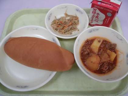 牛肉のトマト煮こみは,新献立でした。新献立という事で,食べる前から楽しみにしている子でいっぱいでした。給食室前からもとてもいい香りがしていました。バジルが入っているので香りを味わっている子や,じゃがいものホクホクとした食感を味わっている子がいました。