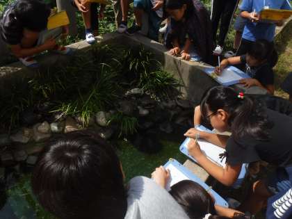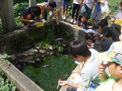 夏の終わりの生き物の様子を観察しています。この日は,これまで観察を続けてきたカメの観察。「春よりも動きが活発になっているようなきがするな。」「冬になったら,気温が低くなるからあまり動かなくなるんじゃないかな。」など,季節による変化について考える様子が見られました。