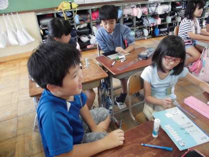 二人組でのやりとりでは,どの文房具を言われるかワクワクしながら注意深く聞いて答える様子が見られました。
