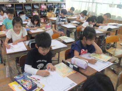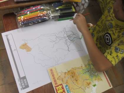 社会科の「京都市のまちの様子」の学習で,山の多い所や人がたくさん住んでいる所などを確認しながら,白地図に色付けをしていきました。「北の方は山が多いよ」「南の方は,家がたくさんある」など,色分けしていくことで気づくことも多かったようです。