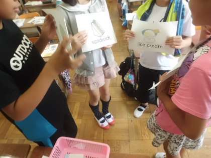 外国語科「My summer vacation」では,「I ate ○○」という表現に慣れ親しむために,トレインゲームに挑戦。自分の食べたものを言うだけでなく,友だちの言ったものも覚えてつなげて言っていくゲーム。過去形の表現もばっちりです!!