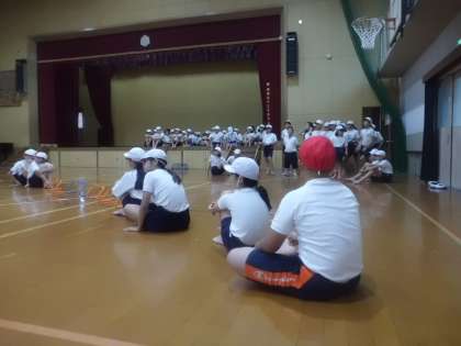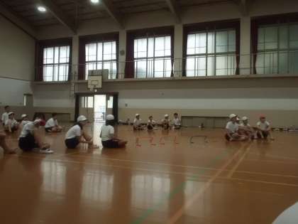 ハードル走では,走る子のインターバルに合わせて,子どもたちがハードルを移動させていきます。誰がどのハードルの移動を担当するのか,体育館の中で確認。運動場でなくても理解できるのは,さすが6年生ですね。