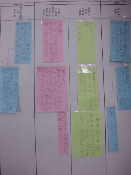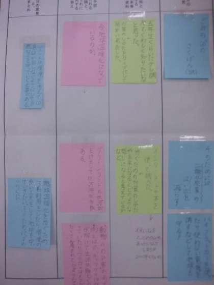国語科「意見を聞き合って考えを深め,意見文を書こう」では,構成表を仕上げることができました。色のついた付箋を使うことで,どのように意見を展開していくのか,分かりやすくなりました。