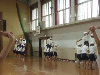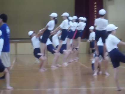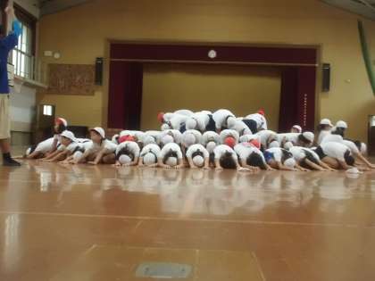 運動会前日の日もあいにくの天気で外では通せず…。それでもいい演技に仕上げようと,体育館で精いっぱい頑張る子どもたち。当日にご期待ください。