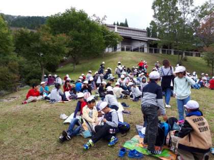 これから水車小屋の周りや芝生広場でお弁当を食べます。朝早くからご準備ありがとうございました。感謝の気持ちを忘れず,いただきます。
