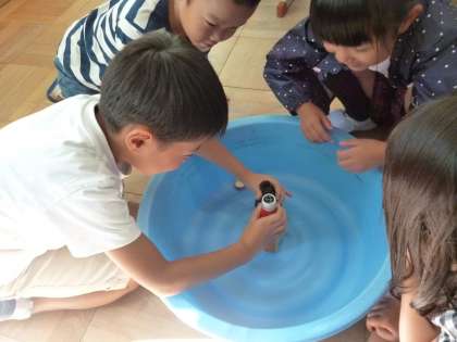 「どちらかの水をもう片方に入れて,あふれるか,あふれないかで分かる」という比べ方を見つけ,実際に試してみました。