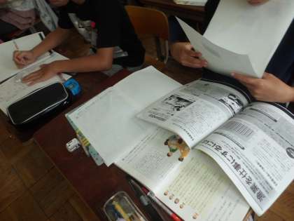 国語科「意見を聞き合って考えを深め,意見文を書こう」では,未来がよりよくあるためにどうすればよいのか,自分の考えと理由とを書き出しました。資料に書いてあったことを加えることで,意見に説得力が増しました。