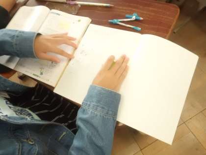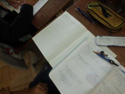 算数科「図形の拡大と縮小」では,今までの学習のまとめの問題に挑戦。1問ずつ教科書を見返しながら取り組む姿も見られました。