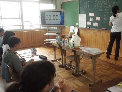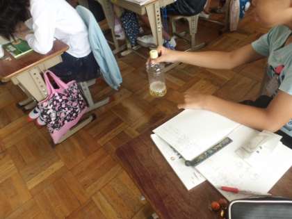 理科「水溶液の性質」では,身近にある液体の容器を観察。そこには「中性」や「弱アルカリ性」の文字があることに気付いた子どもたち。それらをリトマス紙で区別する実験は,次回のお楽しみ!