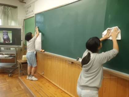 残って黒板をきれいにぞうきんがけする子どもたち。みんなのためにがんばる姿が光っています。