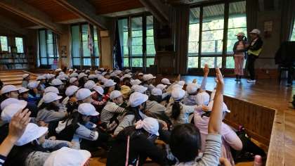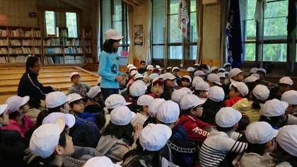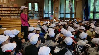 次は,学校ごとに朝の集いをしました。吉祥院小の今日のめあては「挑戦」。子ども達は,今日の活動で頑張りたいことを発表しました。