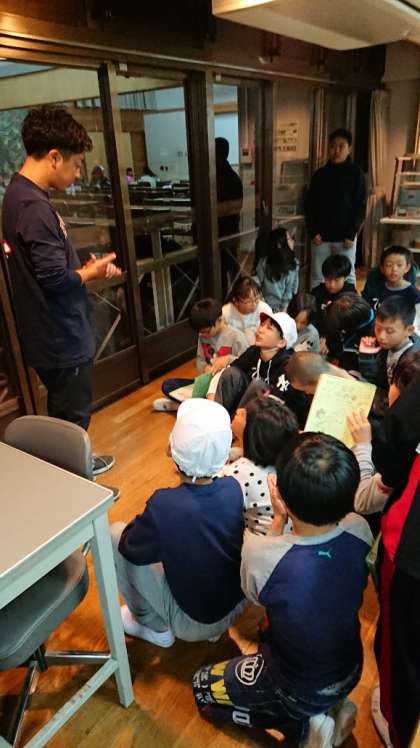 明日は魚つかみにアスレチックを予定しています。夜には,キャンプファイヤーがあるため,係の人は明日に向けて打ち合わせです。