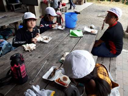 自分でさばいた魚を焼き,お弁当と一緒に食べています。命をいただくことについて学習できました。