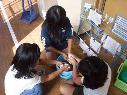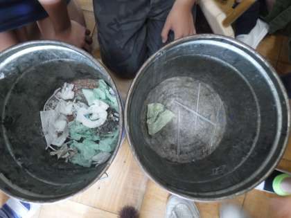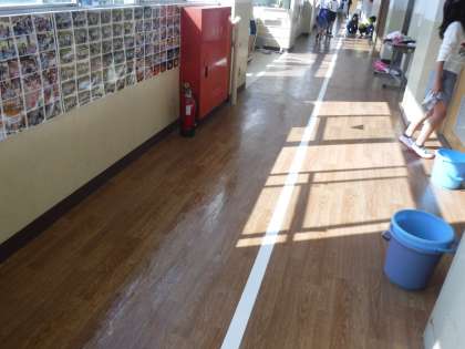 掃除の時間が終わった後も,子どもたちは使った雑巾を絞って綺麗に片づけています。床掃除をした後の廊下はピカピカ。ごみも分別することを意識しています。
