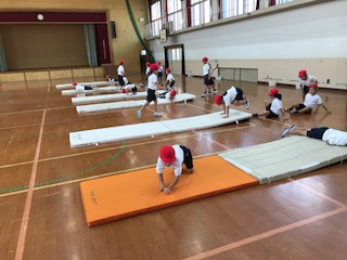 1年生の体育の学習は「マットあそび」です。体育館でグループの友達と協力してマットの準備や後片付けをします。また,順番を守ったり安全に気をつけて取り組んだりしています。