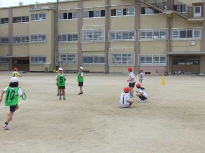 体育科の「リレーあそび」の学習の後半に当たり,チームでバトン渡しの練習をしました。折り返す時に大回りしないように注意して,いい勝負が続きました。