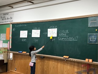 算数では「3つのかずのけいさん」の学習をしています。ネズミさんが初めにバスに乗っていて,次にバス停で何匹か降りて,その次のバス停でまた何匹か乗ると,バスには何匹のネズミが乗っていますか?など,3つの数を使って足したり引いたりする計算を学習しました。子どもたちは「初めに」「次に」「その次に」などの順番を表す言葉を使って,計算の仕方を互いに説明しました。
