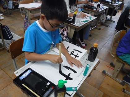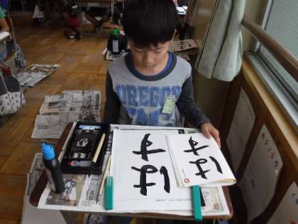 毛筆で「はす」という字を練習しました。「穂先の向きを変える」「軽く止めて,ゆっくり方向を変える。」など,ひらがなの結びの筆づかいを意識して書きました。