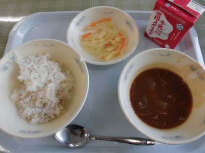 ハッシュドビーフは,ルウから手作りで作りました。中間休みは,給食室から,ルウを作る時に使うバターの良い匂いがしていました。また,たまねぎもしっかり炒めて煮ているので,甘くておいしかったです。今日,ランチルームがあった一年生は,「また食べたい」・「良い匂いがした」という声を聴かせてくれました。