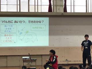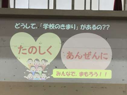 より良い学校生活を送るために,子どもたちみんなにがんばってほしい目標を「生活目標」と呼んでいます。「〜をがんばるぞう」ということから,生活目標のマークは「ぞうさん」です。今月は安全に学校生活を送れるように「ろうかをあるくぞう」です。安全に気をつけて,楽しく学校生活を送ってほしいと思います。1年生の子どもたちも朝会でお話をしっかり聞いていました。