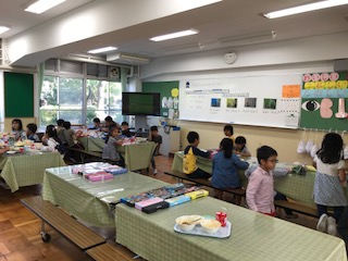 子どもたちが楽しみにしているランチルームでの給食です。ランチルームでは栄養の先生と栄養の学習をします。今回は「ぎゅうにゅうのひみつを知ろう」でした。絵本を読んでもらい,牛乳の栄養を知った子どもたち,毎日給食に出てくる牛乳をがんばって飲んで体をじょうぶにしよう!と思ったようです。