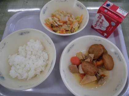 はくさいの煮つけは,寒くなるにつれて甘くなっている白菜を使いました。煮汁に白菜の甘さや,油あげの味が,染み出していておいしかったです。白菜の芯も,柔らかくなるまで煮ているので,児童にも食べやすく好評でした。