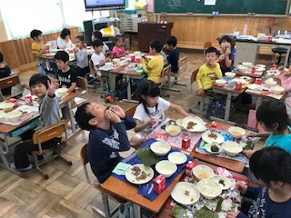 給食で,「肉みそ納豆」をいただきました。手巻きのりもついていて,ごはんに肉みそ納豆をのせて,手巻きのりでくるくる巻いてパクっといただきました。季節は秋。1年生は食欲も旺盛になってきました。もりもり食べて「おいしいね!」と嬉しそうでした。