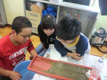 実際に,土の上に水を少しずつ流して,土や水の