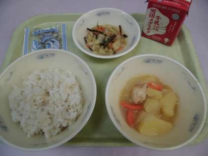 鶏肉と野菜の煮つけは,煮汁に鶏肉のおいしさが,染み出していて,おいしかったです。また,じゃがいもは,時間をかけて煮ているので,柔らかく食べやすかったです。児童は,「じゃがいもがホクホクしていた」「汁がおいしい」という声を聞かせてくれました。