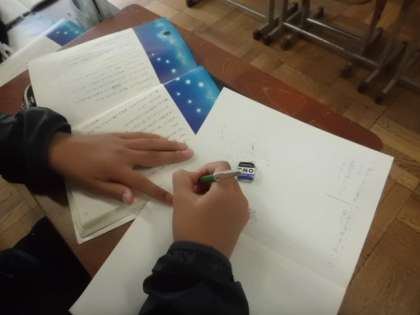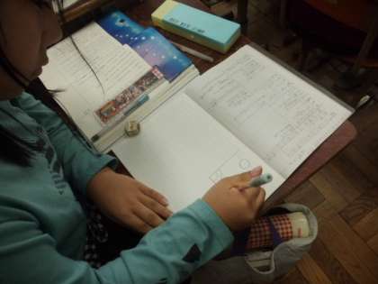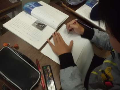 国語科「自分が感じたことを朗読で表現しよう」では,「やまなし」の12月の幻灯を読んで,場面を絵で表すことに挑戦しました。教科書の記述に着目して,色遣いを考えながら描き表すことができました。