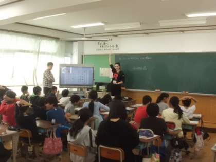 外国語「He is famous. She is great.」では,モンタナ先生と一緒に学習することも。キーワードゲームでは,ネイティブの発音に触れ,大喜びの子どもたちです。