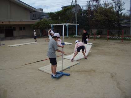 体育科「走り高跳び」では,みんなで協力して準備する姿が見られます。てきぱき準備できるので,活動の時間もたっぷりです。