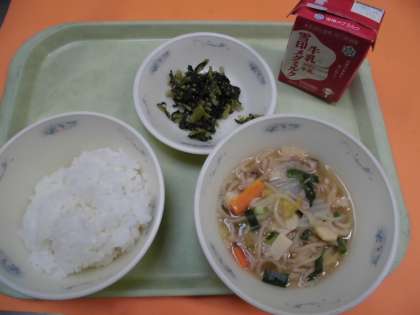 五目あんかけラーメンは,7種類の具が入っていました。出汁に野菜や豚肉の味が染み出していて,おいしかったです。麺も柔らかく食べやすかったです。児童にも,とても好評で「何回でもおかわりできる!」「たけのこの食感が良かった」など,たくさんの声を聞かせてくれました。