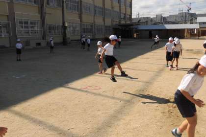 今週から,体育は,とびくらべの学習に入りました。ケンステップという輪を運動場に置き,それをリズムよく跳んで,最後に両足で着地し,跳んだ距離を競います。はじめは,歩数を合わせるのが難しかったり,途中で止まってしまったりする子が多かったのですが,練習するうちに,リズムよく跳べるようになってきました。自然と,班の友達と競ったり,上手に跳ぶ子のまねをしたり・・・・。次の時間には,自分のおもった通りに跳べるように,なるといいですね。がんばれ。