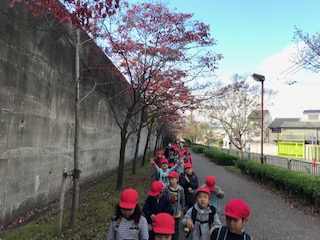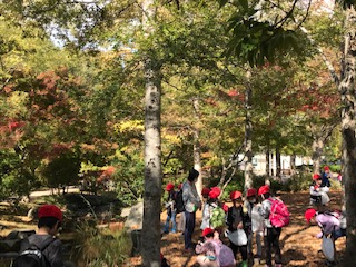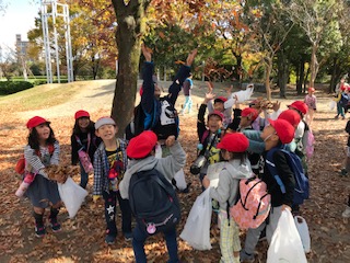 春の遠足でも行った梅小路公園へみんなで出かけました。春と違って,秋は何があるのかな・・・?みんなで公園を散歩しながら,秋色に染まったきれいなはっぱやドングリを拾いました。また,落ち葉がたくさんあるところでは,「おふとんみたい」「はっぱを集めて,おざぶとんみたいにしよう。」などの声が聞かれ,秋の自然を満喫する姿が見られました。おうちの方には,お忙しいところ,お弁当のご用意をありがとうございました。