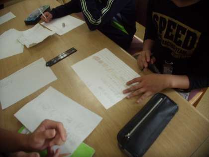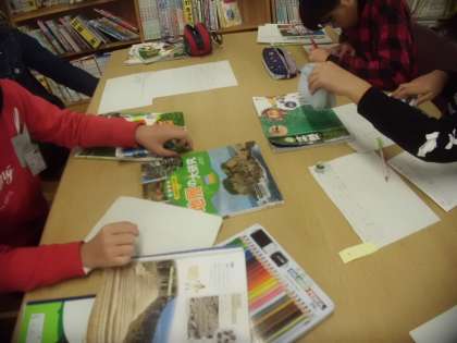 理科「土地のつくりと変化」では,「地層がどうなっているのか」「化石とはどのようなものなのか」など,いくつかの課題に分かれて,図書室で調べ学習をしました。調べたことは1枚のカードにまとめ,後でグループで交流です。