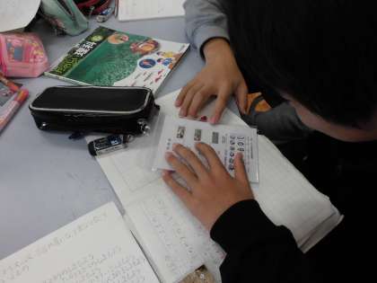 理科「土地のつくりと変化」では,粒度表を見ました。地層によって粒の大きさが違うことを触って感じることができました。