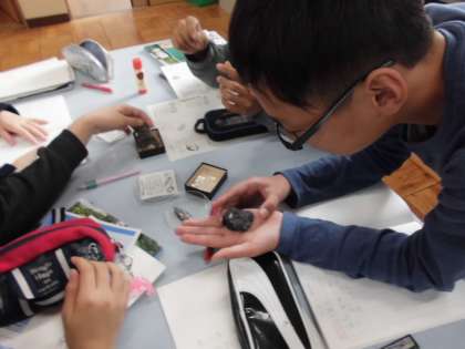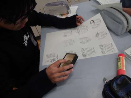 理科「土地のつくりと変化」では,実際の化石を見ました。虫眼鏡で観察することで,石の中に埋まった昔の生き物を見つけることができました。