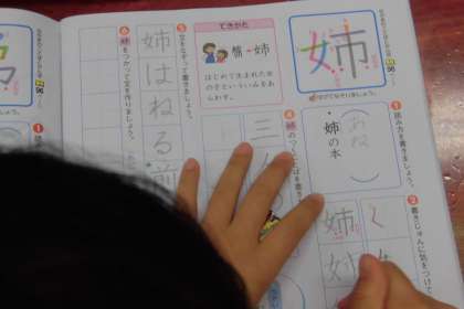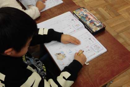 毎週6文字ずつ新出漢字を学習しています。最近は,学習する漢字の画数が多かったり,バランスの取りにくい形だったりと,難しい字がふえてきているので,みんな一生懸命取り組んでいます。今日は,「姉」と「弟」という漢字を学習しました。「姉という漢字の中には,女と市があるよ」「弟の中に,ぺっちゃんこの弓が隠れている」と,漢字の形をとらえるのは上手になってきました。書き順,読み方,使い方を学習してから,いよいよ学習ノートに練習していきます。姿勢よく座り,一画ずつ丁寧に練習する様子が見られました。