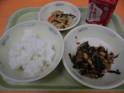 肉みそいためは,みそのしっかりとした味つけで,ご飯がよく進みました。肉だけでなく,大豆やほうれん草・こんにゃくなど,たくさんの具材が入っているので,食感も味わえました。