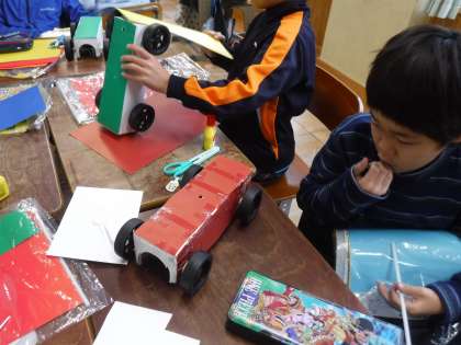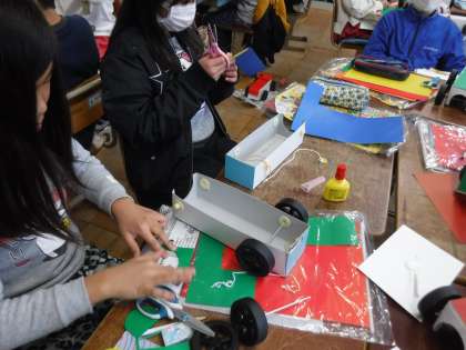 図画工作科の学習では,ゴムの力で走る「ゴーゴードリームカー」を作っています。車体が完成し,飾りつけの段階に入ってきました。子どもたちは自分の思いが表現できるように取り組んでいます。
