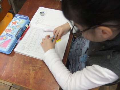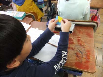 算数科で,自分が作った直角調べの道具を使って,作った形のかどに当てて,直角かどうか確かめました。当て方は,頂点を合わせた後,片方の辺を合わせて他の辺もぴったり合っていたら直角です。作った形のかどは,全部直角ということがわかりました。