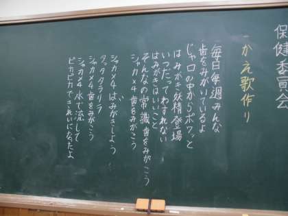 保健委員会では,新しい歯みがきソングを作りました。みんなで意見を出し合って,完成させることができました。