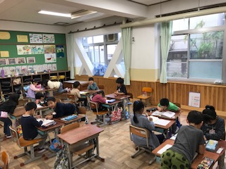 国語科「ともだちにきいてみよう」の学習では,ペアの友達に「今,楽しいと思うことは何ですか。」とインタビューし,さらにそれを「いつ」「だれと」「どこで」するのかなどをたずねます。そして,インタビューしたことを簡単な文章にまとめ,それをクラスのみんなに発表します。子どもたちは発表することを意識して,友達にインタビューしていました。