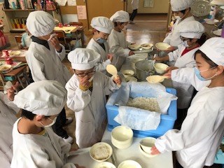 最近,体力もついてきて,なんでもよく食べるようになった子どもたちです。4時間目が終わると,子どもたちは「やった〜!!」とすぐに給食の用意を始めます。給食当番の子どもたちも自分たちで上手に配膳ができるようになりました。この日の給食は,おいしいスープと厚揚げを使ったおかずでした。子どもたちは,おいしそうにパクパクといただきました。