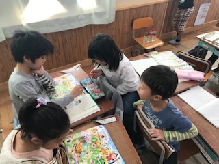 国語科では,世界や日本の楽しい昔話に出会う学習「むかしばなしがいっぱい」をしました。教科書の挿絵を見ながら,これは「ももたろうのおはなしだよ。」「これは,おひめさまが出てくるおはなしだよ。」など友達とお話したり,教科書に知っているお話の挿絵に○したりしていました。次の時間には図書室へ行って,昔話をみつけましょう。