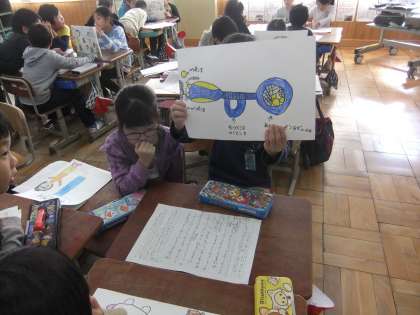 国語科で「あったらいいなこんなもの」の発表会をしました。ドラえもんのように秘密道具を自分が発明して,友だちに知らせました。ゆっくりはっきり言う,質問を考えて聞くなどに気を付けました。みんなワクワクする道具を考えていて,質問や感想などでにぎやかな1時間でした。