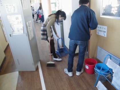 お世話になった学校をきれいにする子どもたち。ふだんできないところにも掃除の手をいれていく子どもたち。おかげでピカピカになりました。